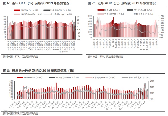 STR酒店数据跟踪:中国内地酒店业(约9000个样本)2月第4周RevPAR绝对值为449.0元,环比-51.32%(第3周为春节时段,RevPAR基数高);较19年同期恢复度为86%。ADR绝对值为437.5元,与19年同期持平;OCC为51.7%,较19年同期-0.9pcts。