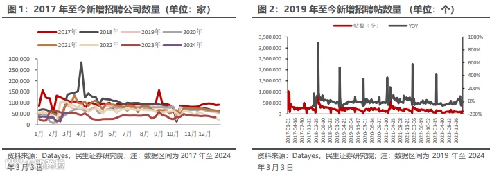 新增招聘帖数量情况:2024年3月3日为止一周,国内新增招聘帖数量121240个,恢复至23年同期的90.24%,恢复至19年同期的51.01%。从环比增长角度来看,3月3日为止一周内国内新增招聘帖数量较2月25日为止一周下降5.17%,较2月18日为止一周增长157.05%,主要受春节假期影响。