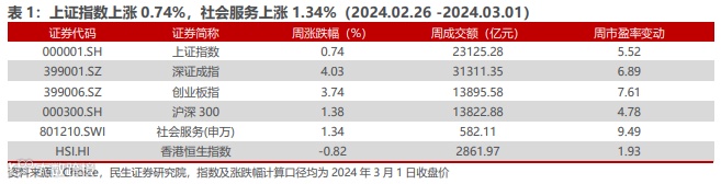 上证指数上涨0.74%,深证成指上涨4.03%,创业板指上涨3.74%,沪深300上涨1.38%,社会服务(申万)上涨1.34%,香港恒生指数上涨-0.82%。