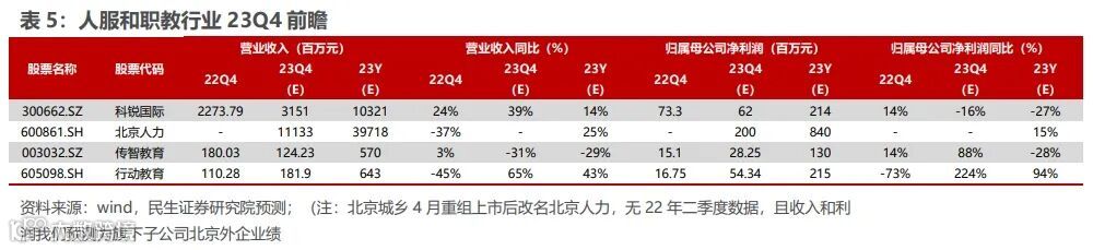 教育个股表现分化。职业教育分类较多,主打就业类的职业教育整体具备顺周期属性,受到23年下游招聘需求的影响;主打企业管理培训的教育企业则具备一定的逆周期属性,在经济疲软下,企业家具备更多的闲暇时间且学习意愿。