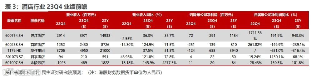 华住集团:Q4总体景气度环比向下。预计 2023Q4 营收49.5 亿元,同比+33.6%;归母净利润 6.58亿元,22年同期为-1.24亿元。