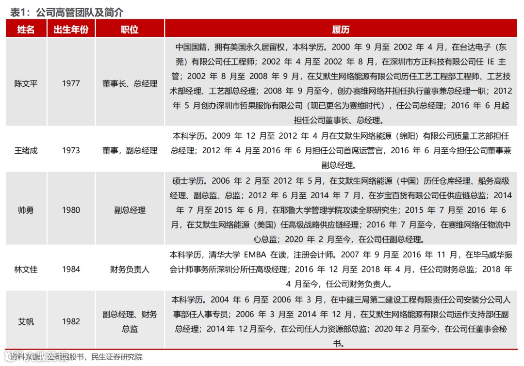 创始人与管理团队在工程与科技领域从业经验丰富。创始人陈文平先生曾在多家公司担任工程师,工艺部经理等职位,2008 年 9 月至今,创办赛维网络并担任执行董事兼总经理一职;2012年5月创办深圳市哲果服饰有限公司(现已更名为赛维时代),任公司总经理;公司核心管理团队皆具备丰富的从业经验,董事兼副总经理王绪成先生曾在艾默生网络能源公司长期担任总经理职务;副总经理帅勇先生曾先后在岁宝百货、艾默生网络能源等企业担任供应链经理一职,对于供应链方面有充足的管理经验与知识储备。