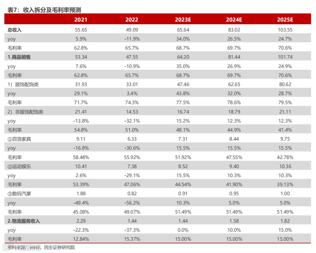 1)服饰配饰类,服饰配饰品牌规模增长、品牌溢价能力提升以及成本不断优化。23Q1-3实现销售收入为 30.79 亿元/yoy+39.62%,毛利率为 77.61%/同比+3.60pct。参考23Q1-3的收入及增速情况,以及四季度为电商旺季,我们预计23-25 年服饰类产品销售收入分别为47.46/62.65/80.62亿元,分别同比+43.8%/32.0%/28.7%。毛利率方面,随着品牌力提升产品件单价提升,毛利率不断提升,23-25年分别实现毛利率77.5%/78.6%/79.5%。