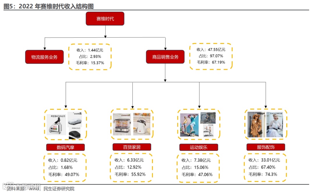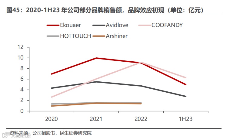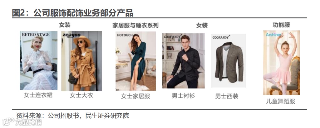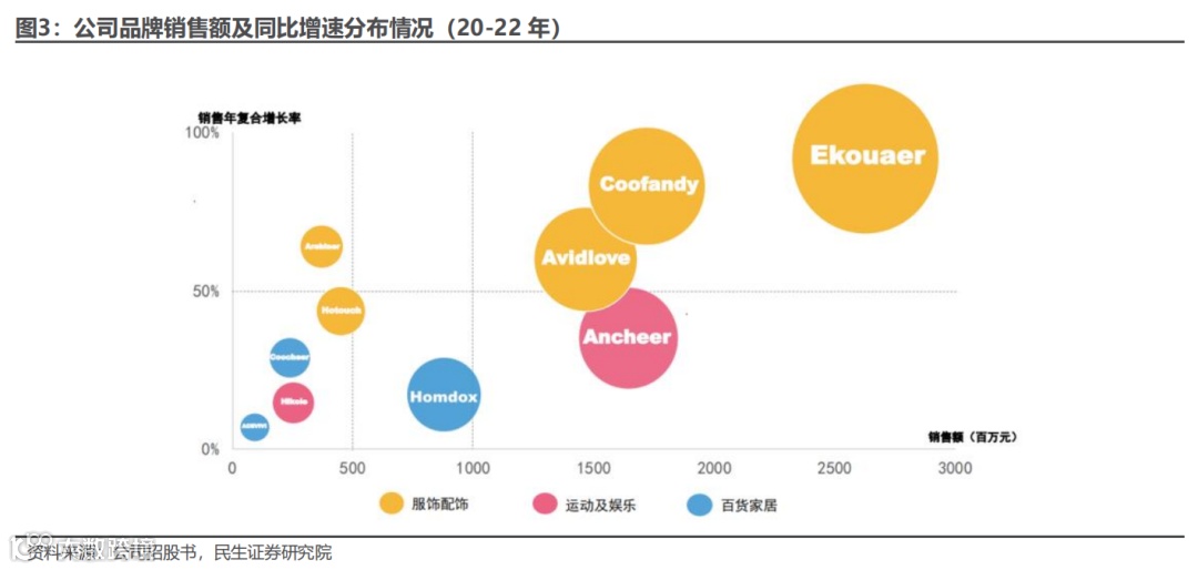 公司主要销售服饰配饰、百货家居、运动娱乐等时尚生活品类产品。公司已孵化 63 个营收过千万的自有品牌,占2022年公司商品销售收入的比重为 88.07%。其中,家居服品牌 Ekouaer、男装品牌 Coofandy、内衣品牌Avidlove、运动器材品牌 ANCHEER 等 21 个品牌2022年营业收入过亿,占商品销售收入比重为 77.38%。百货家居产品包括公司百货家居品牌包括 Homdox、Coocheer、ACEVIVI 等,主要销售高压清洗机、电动足浴盆、爆米花机、干果机、冰箱等产品。公司运动娱乐品牌包括 ANCHEER、Hikole 等,主要销售自行车、滑板车、跑步机、健身器材等产品,公司数码汽摩品牌包括 Coocheer、Sailnovo 等,主要销售 3D 打印机、汽车及摩托车配件等产品。