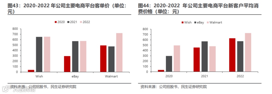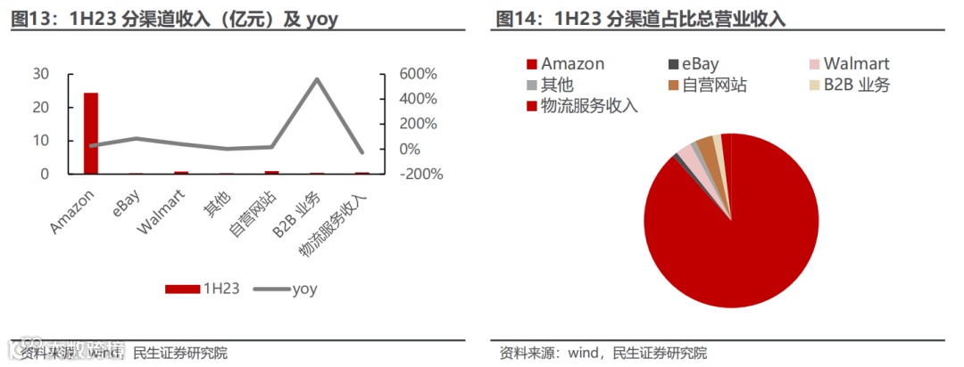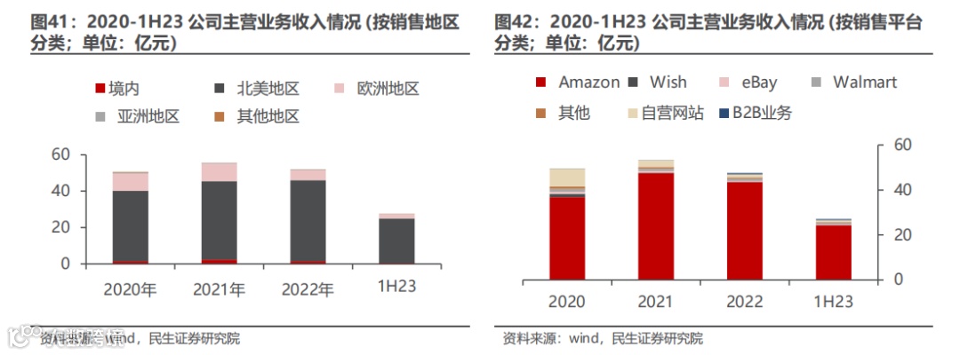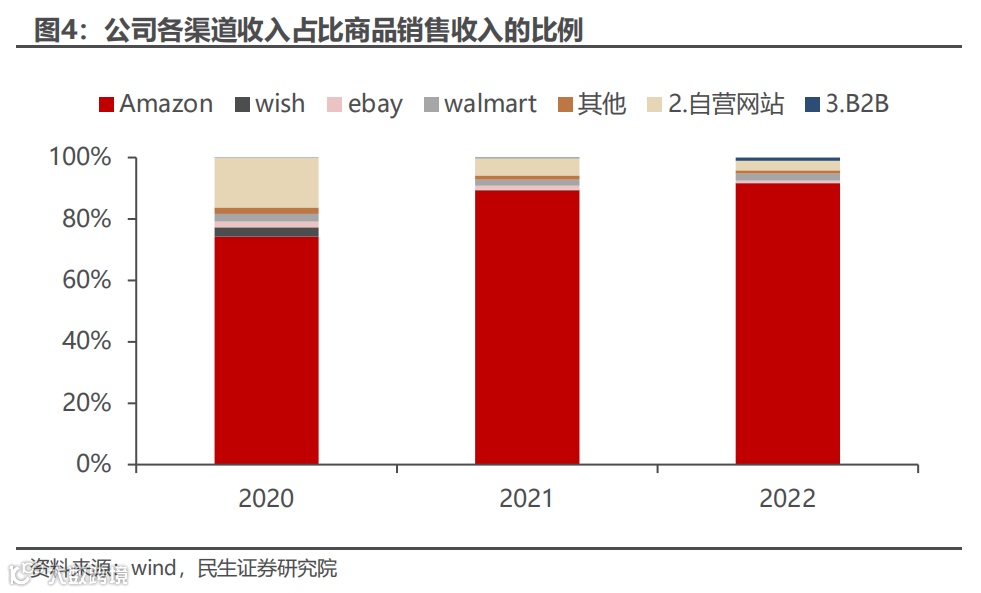 销售较大依赖于亚马逊渠道。公司销售渠道主要为 Amazon、Wish、eBay、Walmart 等第三方电商平台以及 SHESHOW、Retro Stage 等垂直品类自营网站,线上营销网络覆盖美国、德国、英国等多个国家和地区。2020-2022年公司第三方电商平台销售收入占商品销售收入的比重分别为83.7% /94.1%/95.9%,是公司主营业务收入的最主要来源。其中,亚马逊为第三方电商平台中最大的销售渠道,也是公司“品牌化”运营的主要平台,2020-2022在商品销售收入中占比分别为74.3%/89.2%/91.6%,逐年提升。