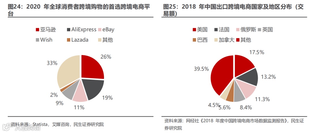 跨境电商企业通过平台政策打造品牌,更大程度的放大和利用 Amazon 平台带来的用户流量优势。目前跨境电商市场上,国际 B2C 跨境电商平台主要有 Amazon、eBay、Wish、Walmart、Newegg等,国内的主流跨境电商平台主要有 AliExpress、京东等。其中,Amazon 是目前最大的全球外贸交易平台。