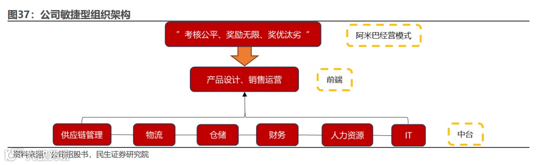 优化组织结构提高效率,适应线上性价比服饰运营规律。公司整合产品设计、销售运营等创意相关部门,设置多个兼具灵活性和创新性的“小前端”,以突出产品差异化定位、提升细节体验、灵活响应市场变化。同时公司结合自身的业务特点,在前端部门中引入“阿米巴经营模式”,并通过“考核公平、奖励无限、奖优汰劣”的励才观,促使公司各部门管理人员均能从全局和效益的角度出发,更加关注自身的产出数据和工作成果。在中台,公司通过整合共享资源搭建了涵盖供应链管理、物流、仓储、财务、人力资源、IT 部门的“大中台”,赋能前端的决策力和执行力。同时,“大中台”也是公司行使中央管控与监督的执行承载体,为前端和中台的良性互动奠定坚实基础。