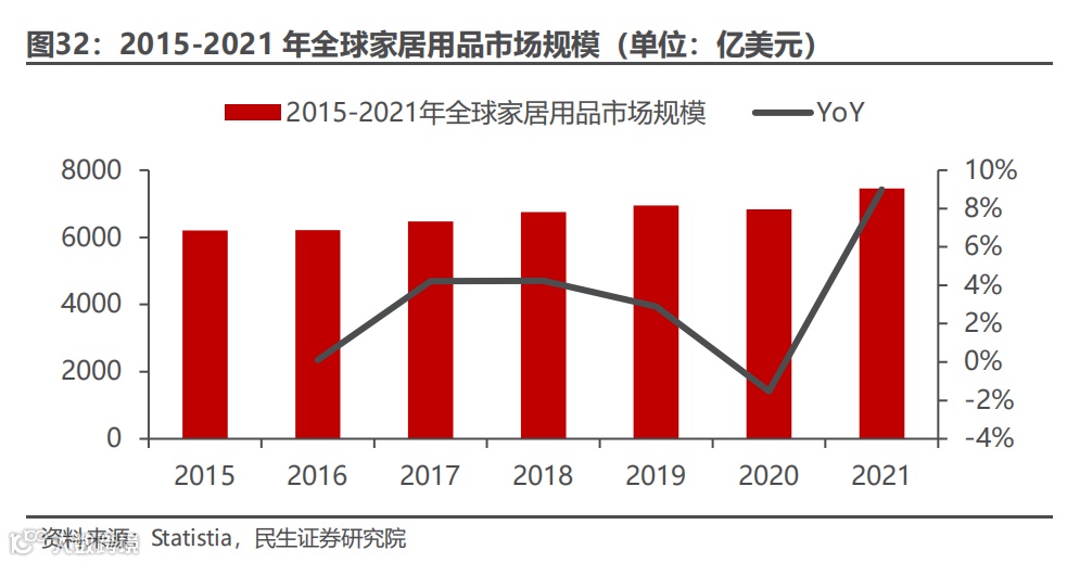 全球家居用品市场规模保持稳步增长,美国为全球最大的家居用品市场。截至 2021 年,全球家居用品市场规模为 7,452.89 亿美元,2015 年至 2021年复合增长率为 3.10%,随着部分发展中国家如中国、印度等国的收入水平进一步提高,全球家居用品消费需求预计将保持稳健增长。