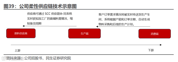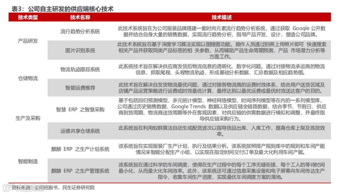 公司的供应端技术主要包括仓储物流技术,生产采购技术,智能制造技术等。仓储物流技术使得公司可利用大数据监控实时物流,结合时效性、服务质量、价格等各方面数据,实现最佳配送方案。生产采购技术主要降低了公司的存货风险。智能生产技术则主要提升了生产效率,并使得生产符合当下个性化的快时尚趋势。