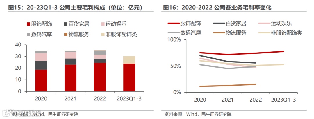 1.商品销售,公司22年主营业务中97.07%的收入来自商品销售业务,按照商品品类,分为服饰配饰类和非服饰配饰类,其中服饰配饰类是公司占比最大的业务,以品牌矩阵模式覆盖服装的多个细分品类,22年占比主营业务收入67.40%。