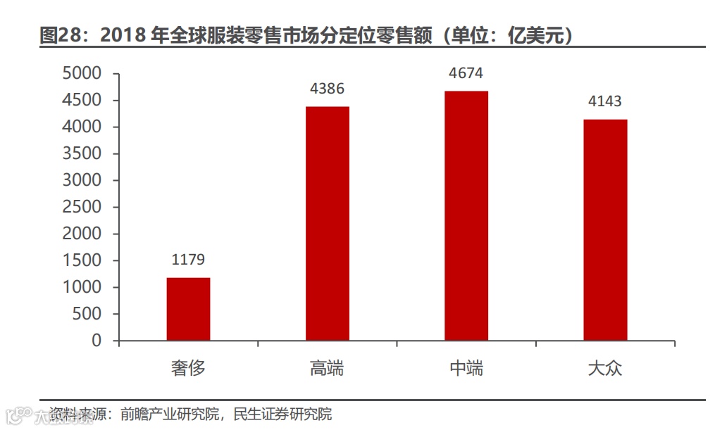 随从服装定位来看,全球服装大致可分为奢侈、高端、中端、大众。目前,全球服装零售市场还是以中端及大众品牌为主。根据前瞻产业研究院数据,2018 年中端及大众品牌服装零售额分别达 4,674 亿美元、4,143 亿美元,占全球服装零售市场零售额比重分别为 32.5%、28.8%。