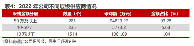 注重搭建兼具广度及深度的自有品牌供应链体系,搭建了多层次、动态的供应商管理体系。首次确认外部供应商时,公司会对研发、采购、制造、品质等方面对供应商进行评分,将供应商分为优选到备选 6 个等级。公司在同类产品下单时,会优先向高等级企业下单;针对现有供应商,公司每季度会从产品质量、产品价格、交付时间、账期等方面对供应商进行持续评分,不符合等级分类标准的供应商将被降级。2022年,公司全部业务供应商共有2000家左右,其中采购金额超过50万的共有281家。大量多样化的上游供应商是产品实现个性化的重要前提之一。