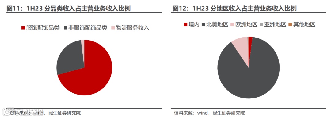 公司主要销售商品在北美地区,欧美市场是重点发展区域。截至1H23,公司商品销售收入占主营业务收入98.07%,其中服饰配饰品类占70.75%。公司的主要销售区域是北美地区,2023 年上半年销售额占主营业务收入的 88.51%,其次是欧洲地区,占主营业务收入 8.83%,公司大力布局欧美区域主要是由于欧美地区整体消费力水平较高,较为适合品牌业务的发展。