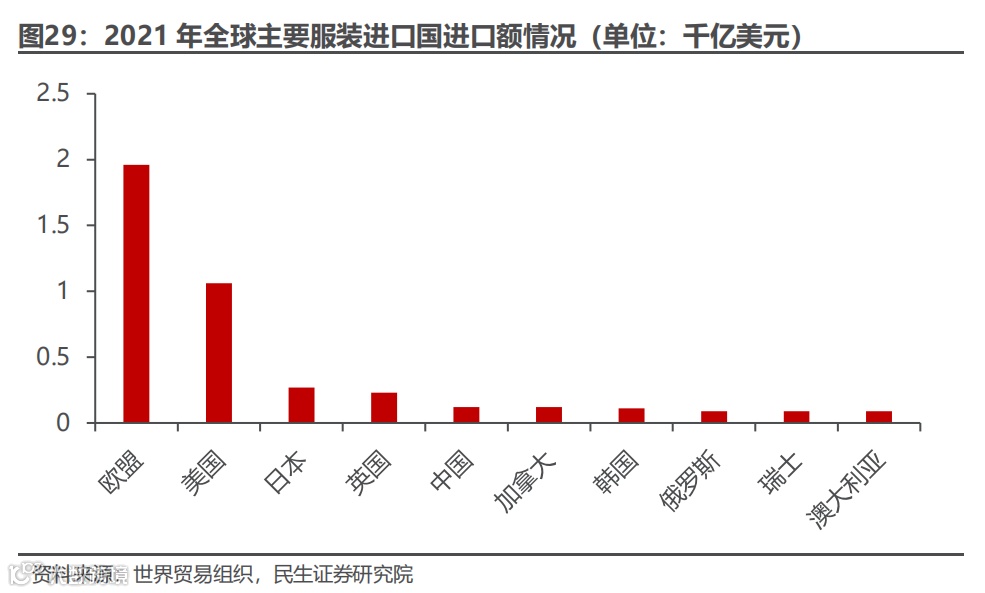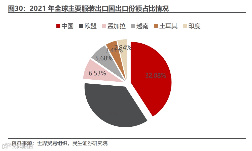欧美为全球服装产业主要进口地。根据世界贸易组织统计数据,2021 年全球服装产业进口金额最多的为欧盟地区,总进口金额约为 1,960 亿美元,占全球市场的 33.9%。美国以约 1,060 亿美元的进口额位列第二,占全球市场的 18.4%。依托服装供应链优势,中国为全球最大的服装出口大国。根据世界贸易组织数据显示,2021 年中国为最大的全球纺织服装产品的供给市场,服装出口份额占比达 32.08%。