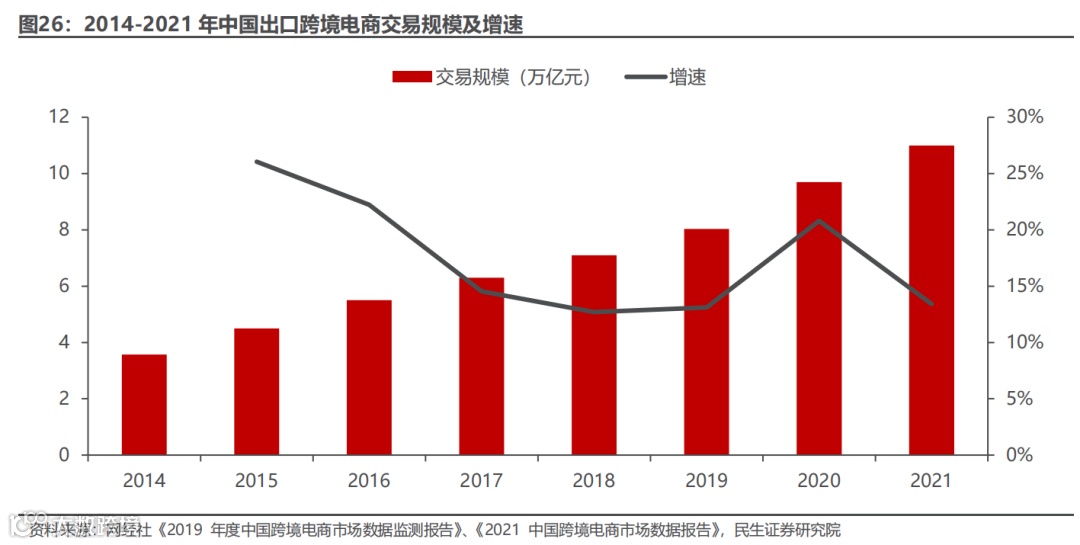 近年来受政策扶持、市场环境改善等利好因素的影响,中国出口跨境电商保持快速扩张的趋势。中国出口跨境电商市场交易规模以年均 20%以上的增速,从 2013 年 2.7 万亿元增长至 2021 年 11.0 万亿元。其中,出口电商网络零售市场交易规模也不断扩大,2019 年中国出口跨境电商网络零售市场交易规模达到1.73 万亿元,同比增长 23.57%。
