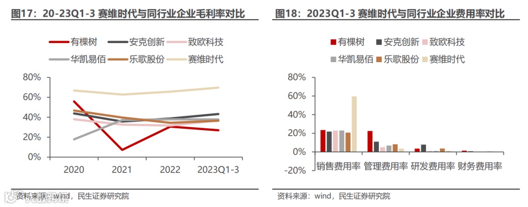 公司综合毛利率领先,销售费用高主要为品质和物流投入。公司成本包括产品成本和头程物流两个部分,华凯易佰除了这2项成本,将尾程物流也计入成本,乐歌股份的成本包括、采购材料成本、直接人工、制造费用以及履约费用,致欧科技的成本中包含产品采购、海运物流、关税及运输费。因此各家的毛利率差异一方面是因为对成本的计算方式不同,另一方面,公司的产品以服装、日用品为主,国内生产具备较为明显的制造优势,因此采购成本较低,2020-2022年产品成本占商品销售收入比例为24.3%/27.7%/26.6%。公司近几年销售费用相对行业内其他企业较高,这是由于为满足客户对产品品质和配送时效的需求,公司保持对业务推广费的较高投入,并持续加大对物流渠道的建设和优化所导致。此外,公司的尾程物流费用计入销售费用,20-22年公司的销售费用中物流费用与销售平台费占据60%左右。