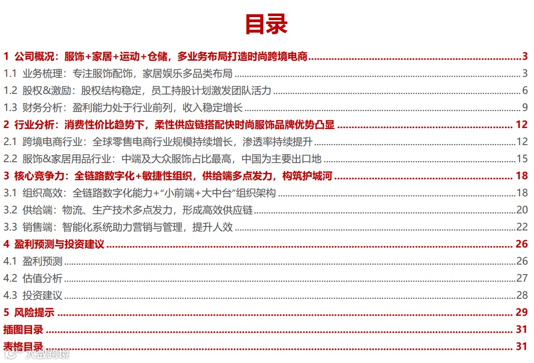 公司以全链路数字化技术打造敏捷快反的时尚产业链,孵化60+千万级别的自有品牌。此外,积极布局海外仓储物流环节,为跨境电商业务降本增效,渠道方面,通过 Shopify平台搭建了自营独立站,迅速成为公司业务的新增长点。我们看好公司在产品、服务、渠道各方面的精细化运营,长期来看成长具有确定性。我们预计23-25年公司实现归母净利润3.80/5.13/6.56亿元,同比增长105.2%/35.0%/27.9%,对应PE为38/28/22X,首次覆盖,给予“推荐”评级。
