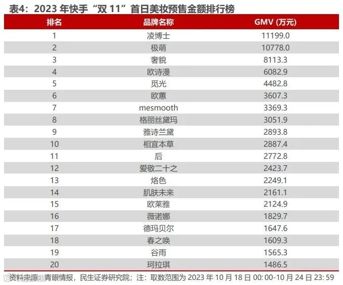 快手平台方面,据青眼情报数据,10月18日-10月24日快手美妆销售TOP20榜单中,国产品牌占比超三分之二,且前五名均为国产品牌,其中,主打“双11仅售现货”的国产品牌位列榜首,实现GMV 1.12亿元;美容仪品牌极萌次之,实现GMV 1.08亿元;奢貌、欧诗漫、觅广位列3-5位,分别实现GMV 0.81亿元、0.61亿元、0.45亿元。