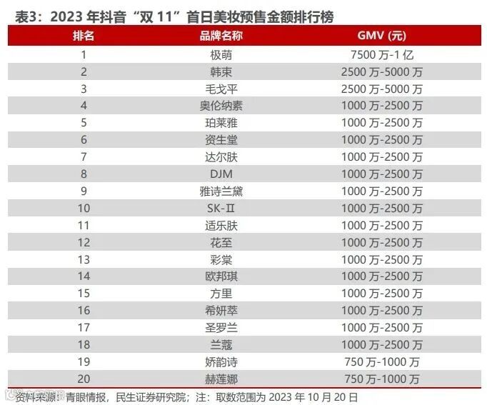 抖音平台方面,据青眼情报数据,抖音美妆“双11”首日(10月20日)Top10中,国产品牌占据4席,且均位列前五,分别为①极萌:位列第一,GMV为7500万元~1亿元;②韩束:位列第二,GMV为2500万元-5000万元;③毛戈平:位列第三,GMV为2500万元-5000万元;④珀莱雅:位列第五,GMV为1000万元-2500万元。