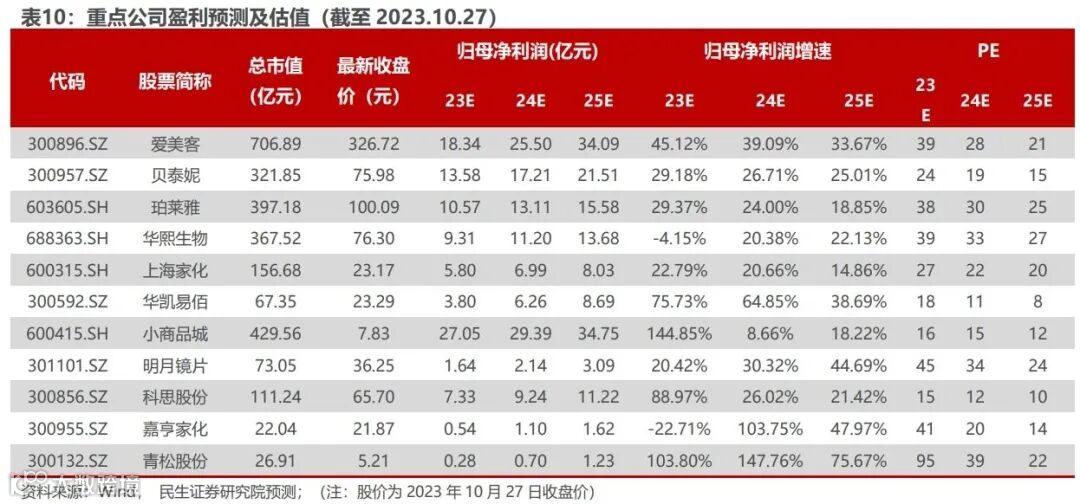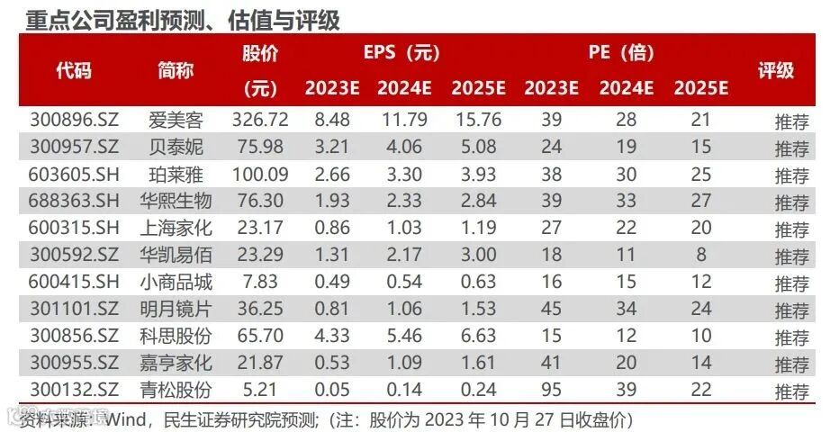 高奢品牌伊菲丹品牌资产建设持续加码,品牌势能持续强化,期待后续持续高增。1)品牌建设方面,10月14日,伊菲丹品牌官宣超级面膜首位代言人杨紫,24年法国巴黎奥运会召开,有望带动线下流量和品牌势能再升级。2)渠道方面,9月28日,伊菲丹中国首家线下店落户杭州武林银泰,此外,在合肥银泰中心、成都SKP开启快闪店、限时店等,线下渠道不断完善。根据魔镜数据,3Q23伊菲丹品牌天猫销售额为1259万元,同比+28.60%。3)品类方面,伊菲丹从22年的超级面膜出发,逐渐拓宽大单品矩阵,目前天猫旗舰店售有化妆水、乳液、面霜、精华等产品。