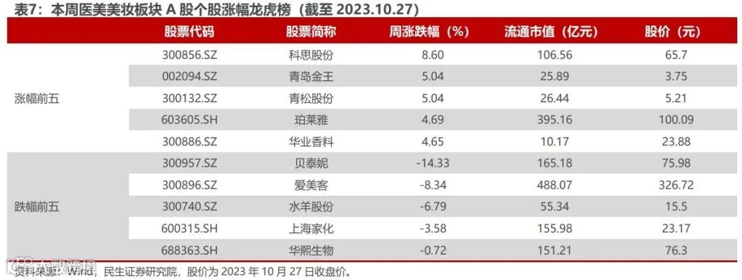 医美美妆跌幅前五:贝泰妮(-14.33%)、爱美客(-8.34%)、水羊股份(-6.79%)、上海家化(-3.58%)、华熙生物(-0.72%)。