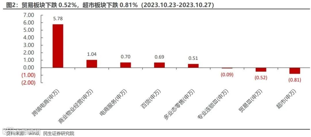 本周商贸零售各细分板块:超市板块下跌0.81%,专业连锁板块下跌0.09 %,百货板块上涨0.69%,跨境电商板块上涨5.78%,商业物业经营板块上涨1.04%,贸易板块下跌0.52%,电商服务板块上涨0.70%,多业态零售板块上涨0.51%。