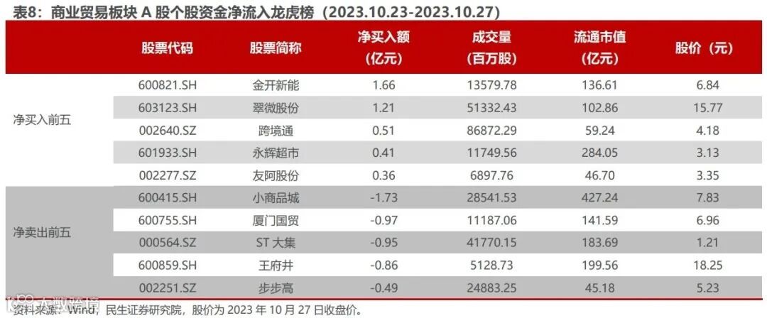商业贸易净买入前五:金开新能(1.66亿元)、翠微股份(1.21亿元)、跨境通(0.51亿元)、永辉超市(0.41亿元)、友阿股份(0.36亿元);