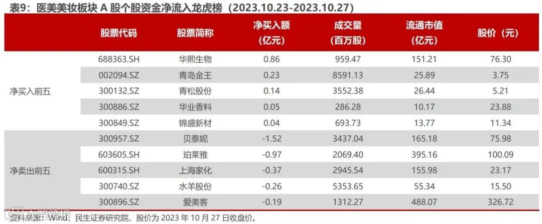 医美美妆净买入前五:华熙生物(0.86亿元)、青岛金王(0.23亿元)、青松股份(0.14亿元)、华业香料(0.05亿元)、锦盛新材(0.04亿元);