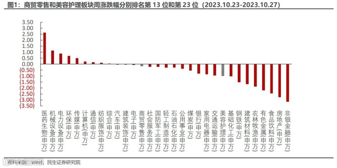本周31个申万一级行业:商贸零售板块(-0.17%)和美容护理板块(-0.99%)在31个申万一级行业中分别排名第13位和第23位。本周涨幅最大的板块是医药生物(2.63%),跌幅最大的非银金融(-3.14%)。