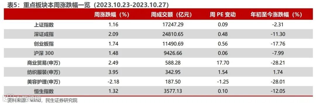 本周各主要指数:上证指数板块上涨1.16%,深证成指板块上涨2.09%,创业板指板块上涨1.74%,沪深300板块上涨1.48%,商业贸易板块上涨2.49%,纺织服装板块上涨3.95%,美容护理板块下跌2.18%,恒生指数板块上涨1.32%。