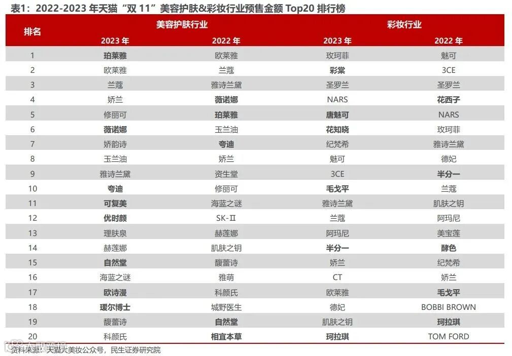 根据天猫“双11”彩妆预售首日品牌成绩单,预售有效成交额Top20品牌中,国货品牌共有6个,较22年增加1个,其中上市公司旗下品牌仅彩棠(珀莱雅),预售金额位列排行榜第二。