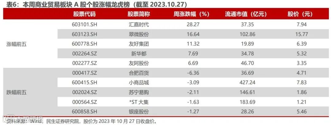商业贸易涨幅前五::汇嘉时代(28.27%)、翠微股份(16.64%)、友好集团(11.32%)、新华都(7.69%)、友阿股份(6.69%);