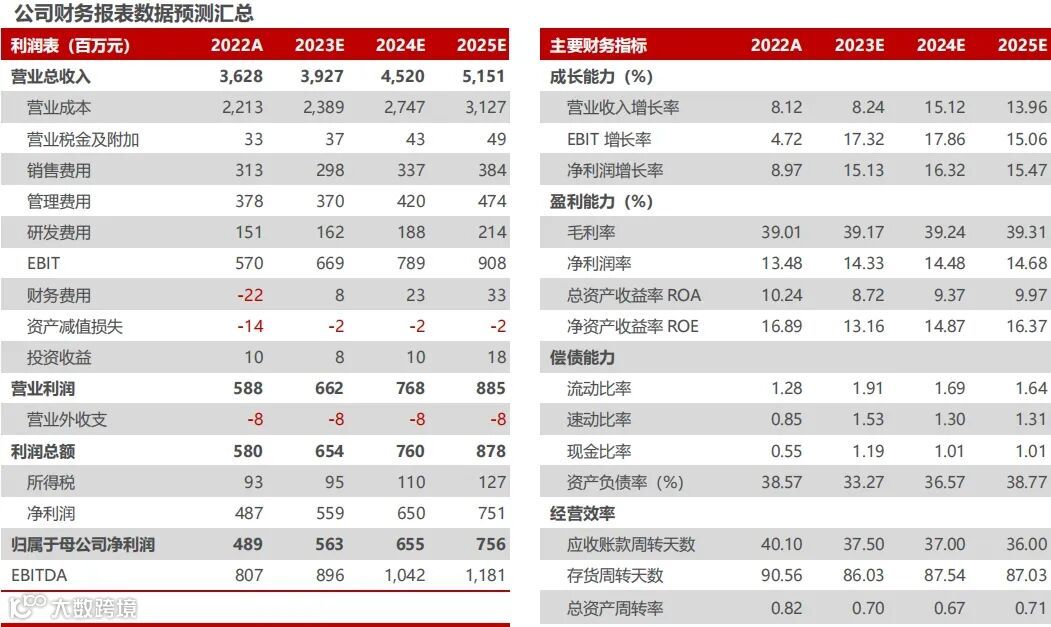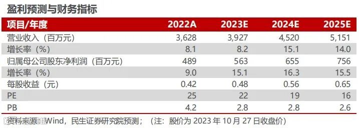 投资建议:我们预计2023-2025年公司实现营业收入39.27、45.20、51.51亿元,分别同比+8.2%、+15.1%、+14.0%;归母净利润分别为5.63、6.55、7. 56亿元,同比+15.1%、+16.3%、+15.5%,对应PE为22、19、16倍,维持“推荐“评级。