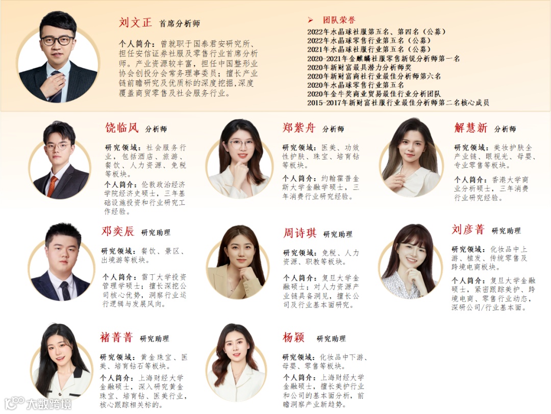 正视可选消费&海外研究 华西证券可选消费大组刘文正团队,大组深度覆盖社会服务、海外大消费、科技互联网、品牌及专业零售、电商、家电、纺服教育、轻工制造、黄金珠宝、医美美妆及潮玩IP等新兴消费等细分领域,探寻消费及海外研究深度价值!欢迎关注!