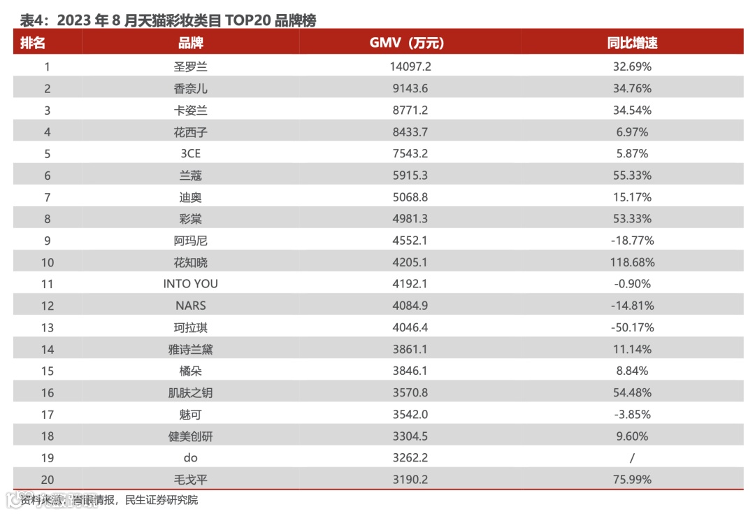 2023年8月天猫彩妆类目GMV为20.28亿元,同比增长6.63%,TOP20品牌的GMV占彩妆类目的54.06%。