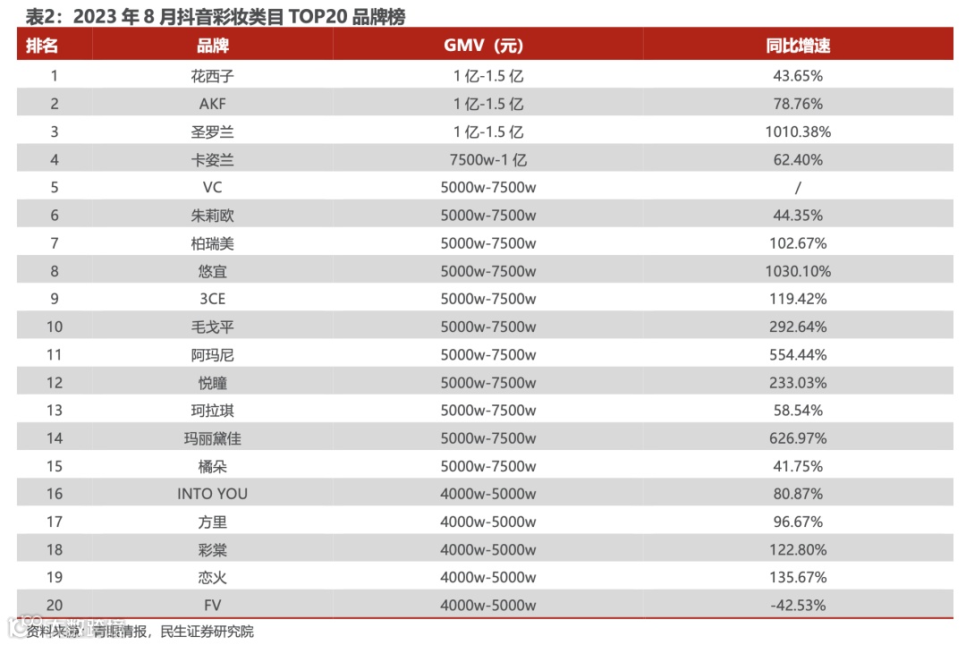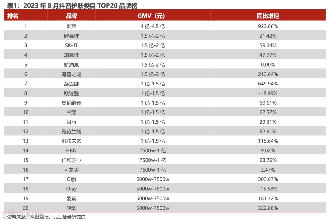 2023年8月,抖音护肤类目GMV超90亿元,同比增17.66%,TOP20品牌的GMV占护肤类目的28.28%。