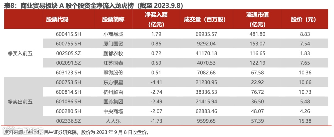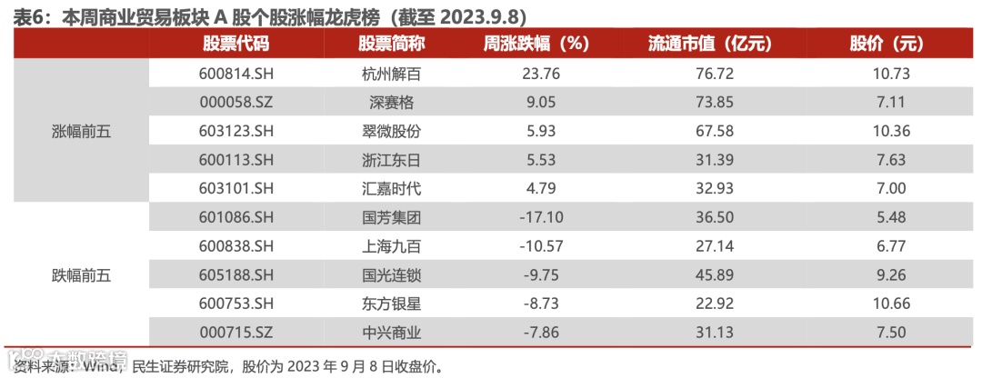 商业贸易涨幅前五:杭州解百(23.76%)、深赛格(9.05%)、翠微股份(5.93%)、浙江东日(5.53%)、汇嘉时代(4.79%);