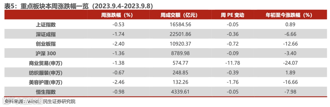 本周各主要指数:上证指数板块下跌0.53%,深证成指板块下跌1.74%,创业板指板块下跌2.40%,沪深300板块下跌1.36%,商业贸易板块下跌1.38%,纺织服装板块下跌0.67%,美容护理板块下跌2.46%,恒生指数板块下跌0.98%。