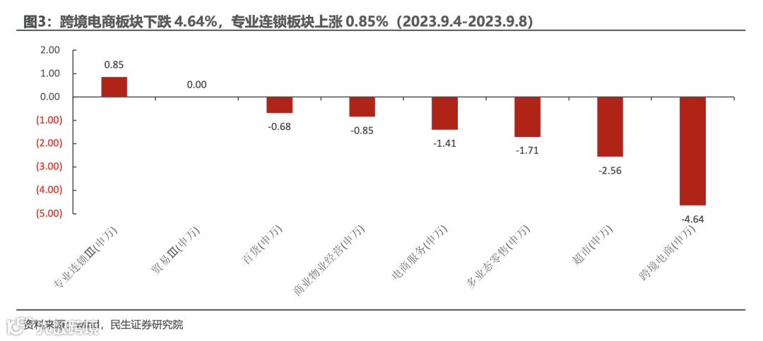 本周商贸零售各细分板块:跨境电商板块下跌4.64%,多业态零售板块下跌1.71%,超市下跌2.56%,商业物业经营下跌0.85%,百货下跌0.68%,贸易下跌4.50%,电商服务上涨0.00%,专业连锁上涨0.85%