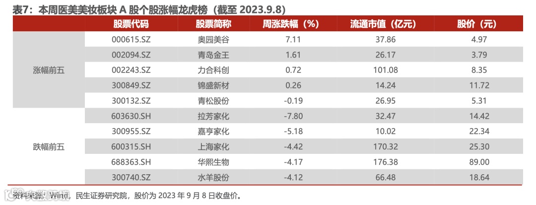 医美美妆跌幅前五:拉芳家化(-7.8%)、嘉亨家化(-5.18%)、上海家化(-4.42%)、华熙生物(-4.17%)、水羊股份(-4.12%)。
