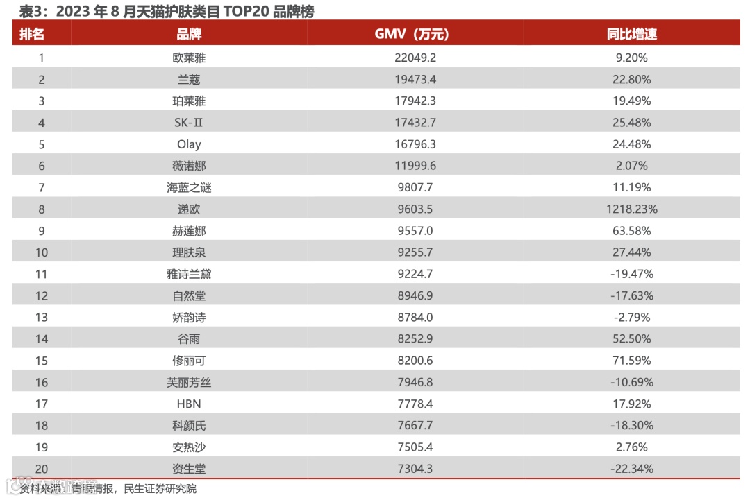 2023年8月,天猫护肤类目GMV为74.92亿元,同比下滑8.95%,TOP20品牌的GMV占护肤类目的30.1%。