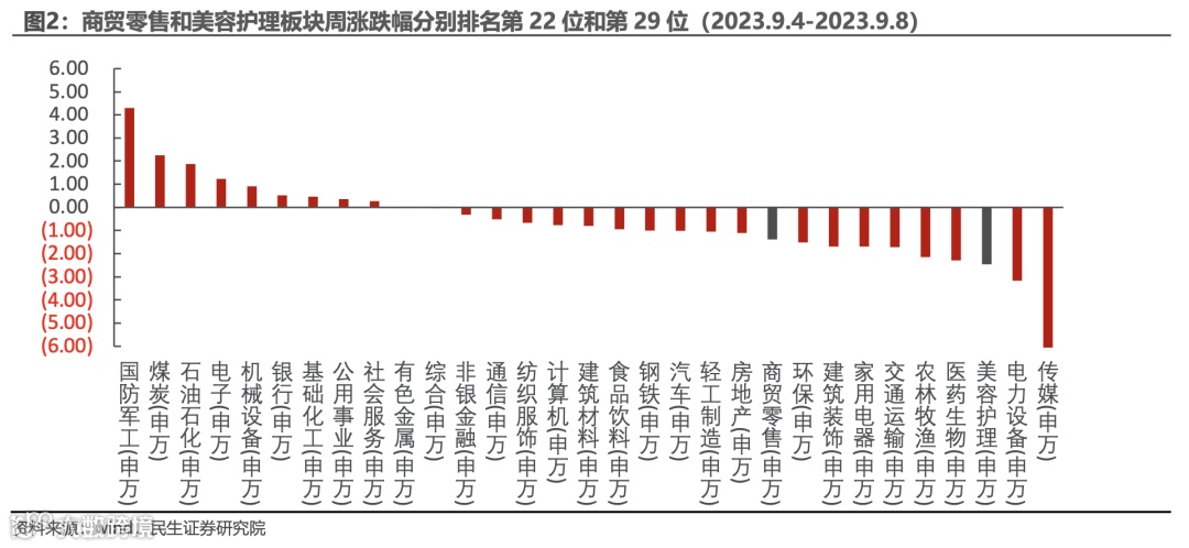 本周31个申万一级行业:商贸零售板块(-1.38%)和美容护理板块(-2.46%)在31个申万一级行业中分别排名第22位和第29位。本周涨幅最大的板块是国防军工(+4.30%),跌幅最大的板块为传媒(-6.59%)。