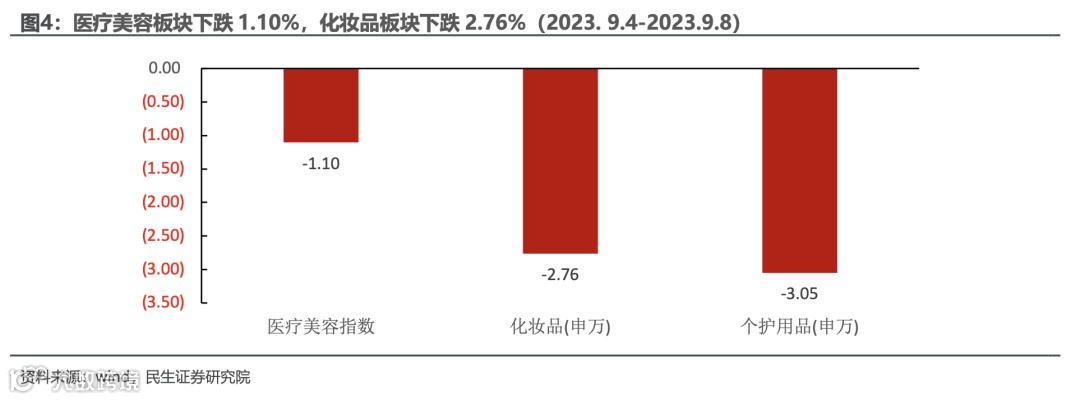 本周美容护理各细分板块:医疗美容板块下跌1.10%,化妆品板块下跌2.76%,个护用品板块下跌3.05%。