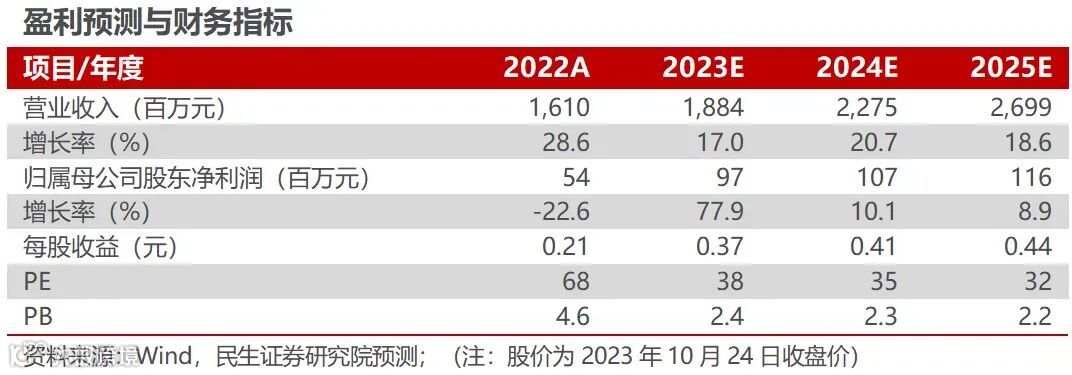 投资建议:预计2023-2025年公司实现营收18.84、22.75、26.99亿元,分别同比+17.0%、+20.7%、+18.6%;归母净利润为0.97、1.07、1.16亿元,分别同比+77.9%、+10.1%、+8.9%,10月24日收盘价对应PE 38、35、32倍,维持“推荐“评级。