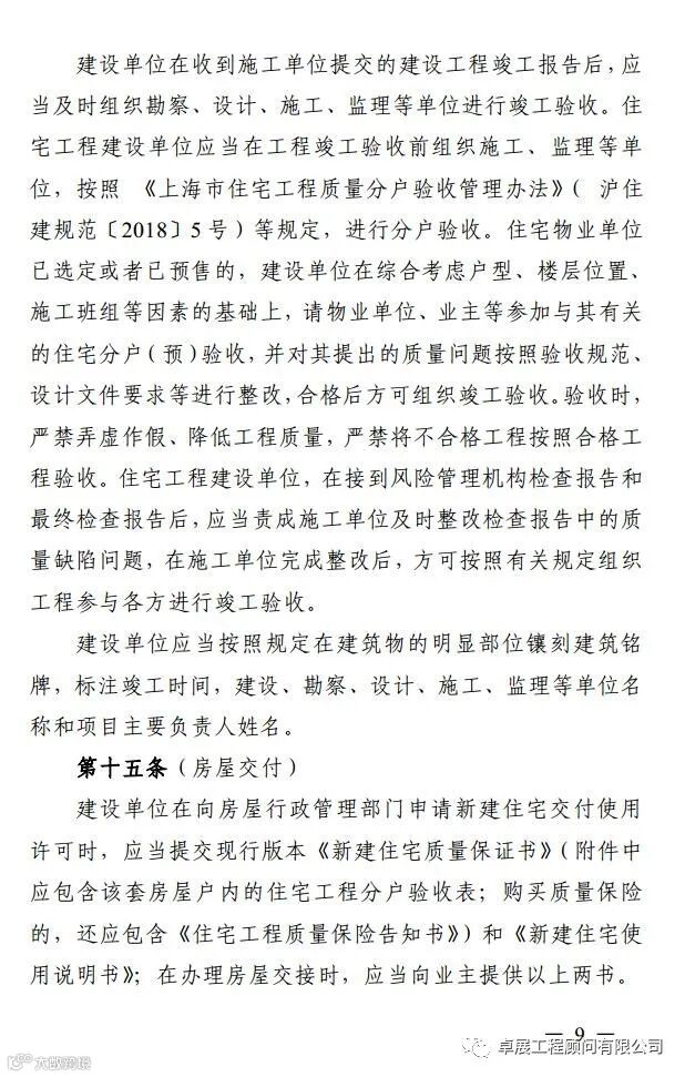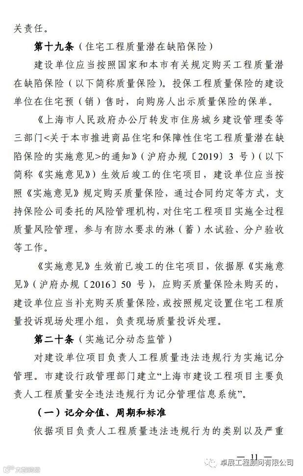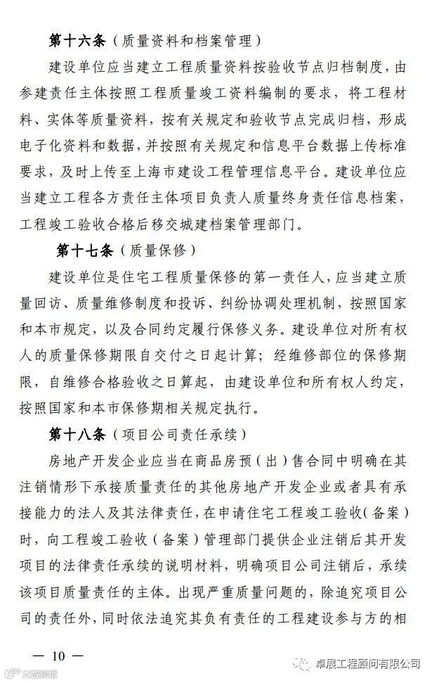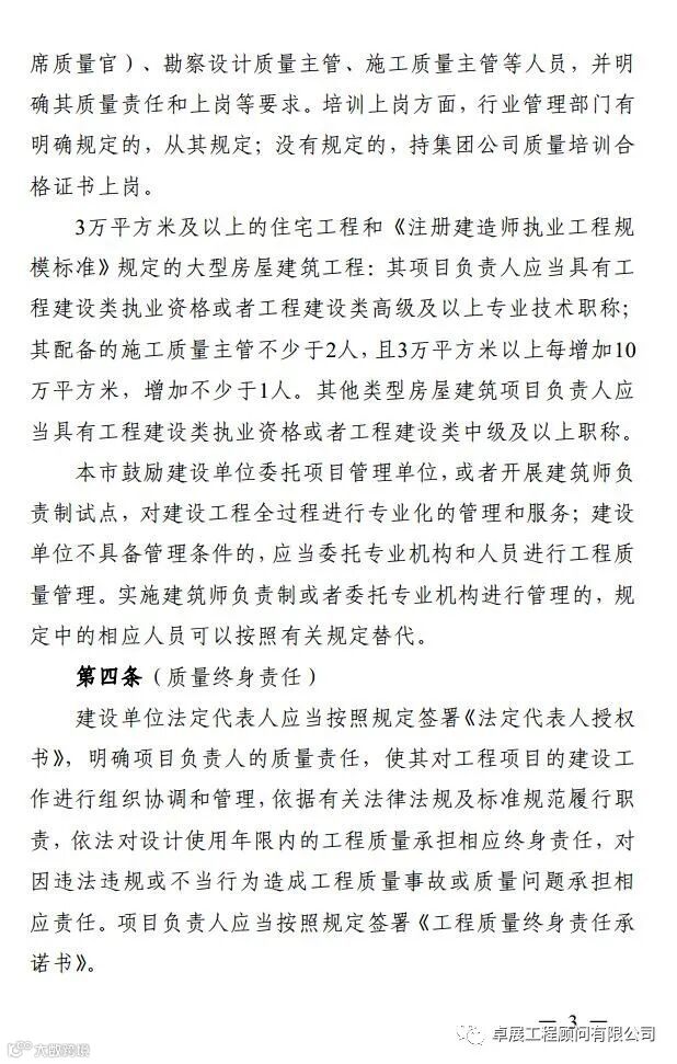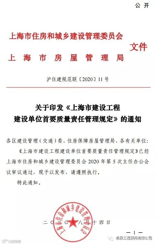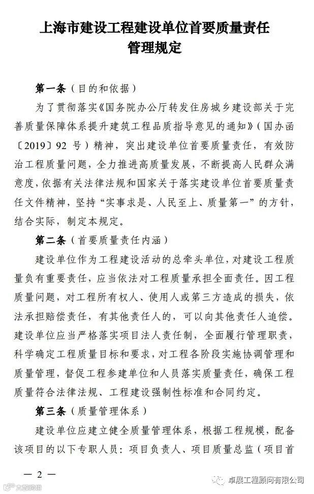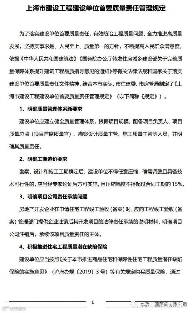近日,上海市住建委、市房管局制定了《上海市建设工程建设单位首要质量责任管理规定》(以下简称《规定》)。《规定》中明确建设单位应建立健全质量管理体系,根据项目规模,配备项目负责人、项目质量总监(项目首席质量官)、勘察设计质量主管、施工质量主管等人员,并明确其质量责任。