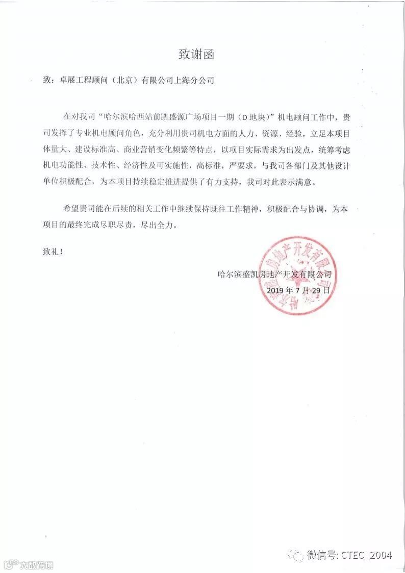 对于凯盛源广场这个项目,卓展团队的成员们打起十二分的精神,对每一个方案的细节,每一个施工图的审核,再到二次设计的精装设计,都认真尽职,为客户解决问题。也正是卓展团队的这份认真与努力,让客户赞不绝口。并由凯盛源广场项目的开发商——北京凯盛源集团特地发来致谢函: