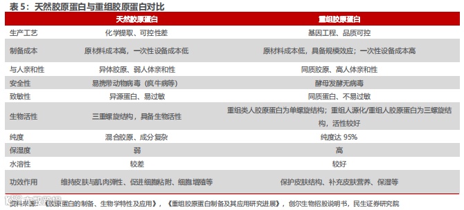 同时,消费者呈现需求多样化,而非单一聚焦补水,胶原蛋白更符合消费需求下的发展趋势。对于痤疮、皮炎等皮肤问题的患者对于祛痘美白的需求日益增长;轻医美流行后,术后人群急需具有保湿、修复效果的皮肤护理产品;追求功效性护肤的消费者则愈发注重各类活性成分在解决肌肤问题上的高效性。相比于玻尿酸相对单一的补水功效,胶原蛋白具有修复保湿、美白抗衰、润滑肌肤等多重功效,其中重组胶原蛋白的功效性表现突出,而其自身的低致敏性和更易量产能力,有望满足消费者日益增长的皮肤护理和修护需求。
