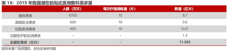 对应贴式医用敷料的原料及功效,其贴式医用敷料的用户大致可分为三类:一类为具有痤疮、皮炎等皮肤问题的患者,一类为接受轻医美手术后急需皮肤修复的医美人群,一类为追求功能性护肤的消费者。据标点医药,2019年三类人群潜在的贴式医用敷料需求量达到11.065亿片,实际需求量为3.37亿片,渗透率仅30%,尚存在较大可提升空间。