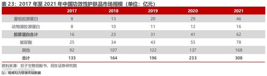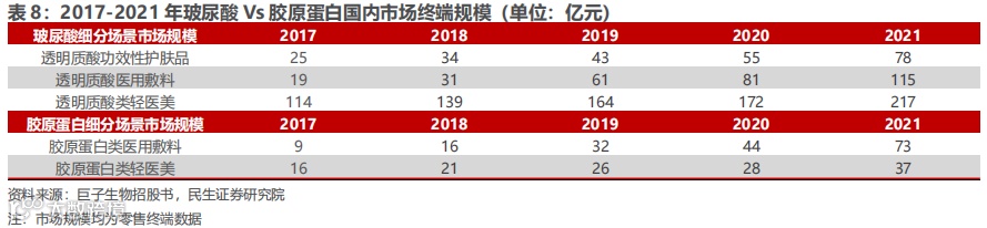 从市场规模,胶原蛋白因生产制备方式导致的问题致使其应用市场拓展缓于玻尿酸;但从注射剂的功效角度看,胶原蛋白类注射剂更具多样化作用效果。对比医美市场规模情况,根据弗若斯特沙利文,2021年中国胶原蛋白类轻医美的市场规模约为37亿元,同比增速为32.14%;而玻尿酸类轻医美项目市场规模约217亿元,同比增速26.16%,呈现出玻尿酸远远超过胶原蛋白注射剂。但相比于玻尿酸具有单一的保水性,胶原蛋白富含亲水性的天然保湿因子,同时还可以参与改善细胞代谢、增强皮肤中胶原蛋白活性。