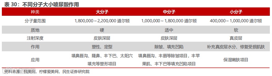 玻尿酸注射剂的需求分为三类,包括补水/改善肤色、充填软组织、塑性。玻尿酸分子的大小会影响其质地,进而影响吸收时间。分子越大质地越硬,吸收时间越长;分子越小越软,吸收的时间越短。因此质地硬的大分子主要用于填充定型;质地适中的中分子主要用于填充凹陷、除皱;质地软的小分子适合补水和修复皮肤。由于单链玻尿酸分子半衰期为1-2天,需要通过交联的手段,将单链的玻尿酸分子链连接成网状或立体状的高分子结构,经过交联的玻尿酸可在体内维持数月甚至数年。